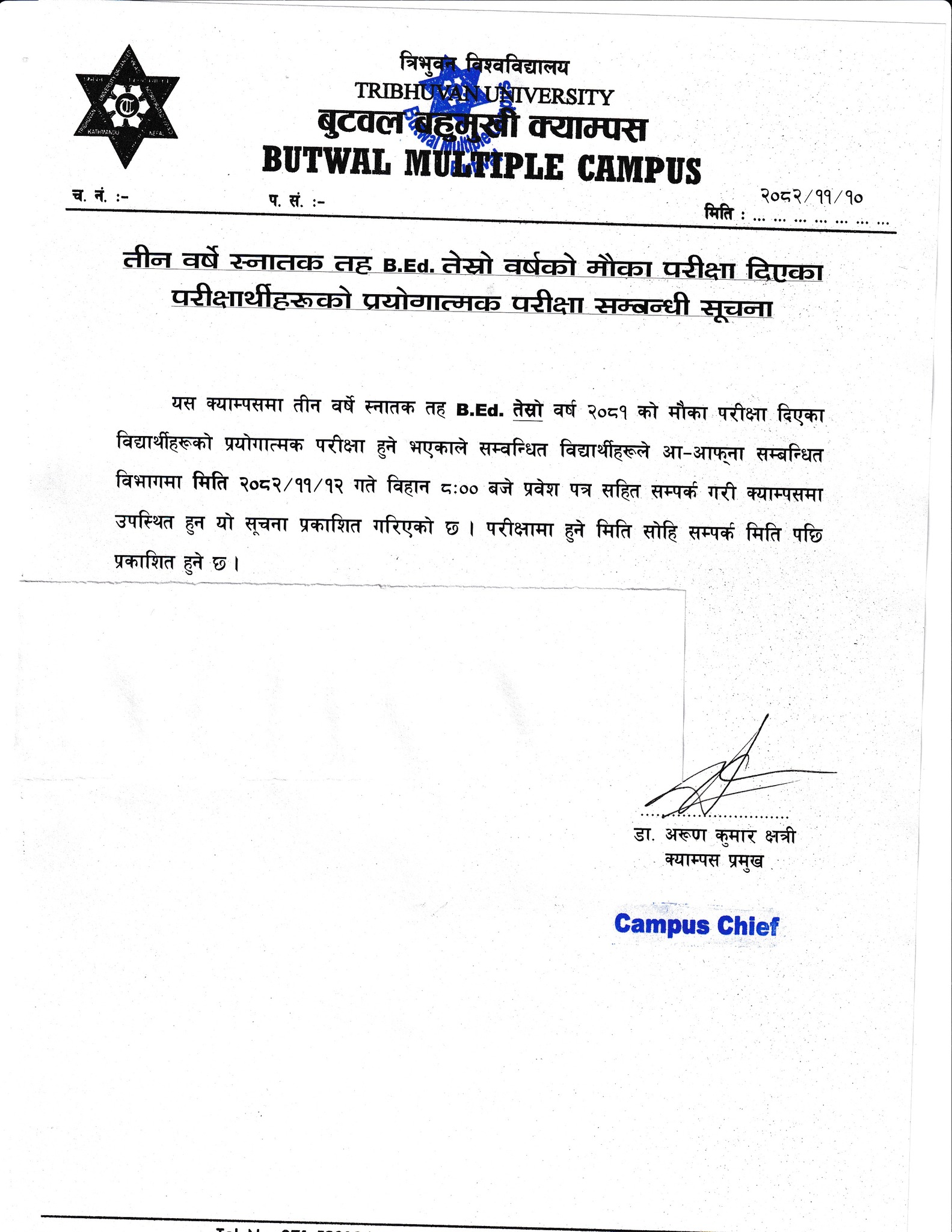 ३ वर्षे स्नातक तह B.Ed. तेश्रो वर्षको मौका परीक्षा दिएका विद्यार्थीहरुको प्रयोगात्मक परीक्षा सम्बन्धी सूचना