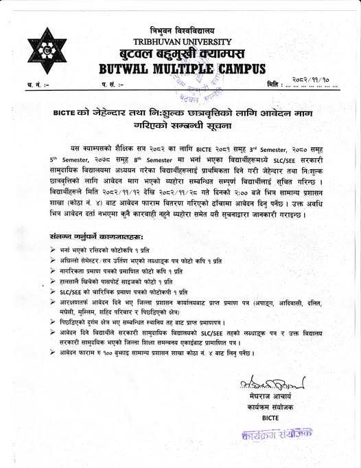 BICTE को जेहेन्दार तथा नि:शुल्क छात्रवृतिको लागि आवेदन माग गरिएको सम्बन्धी सूचना |