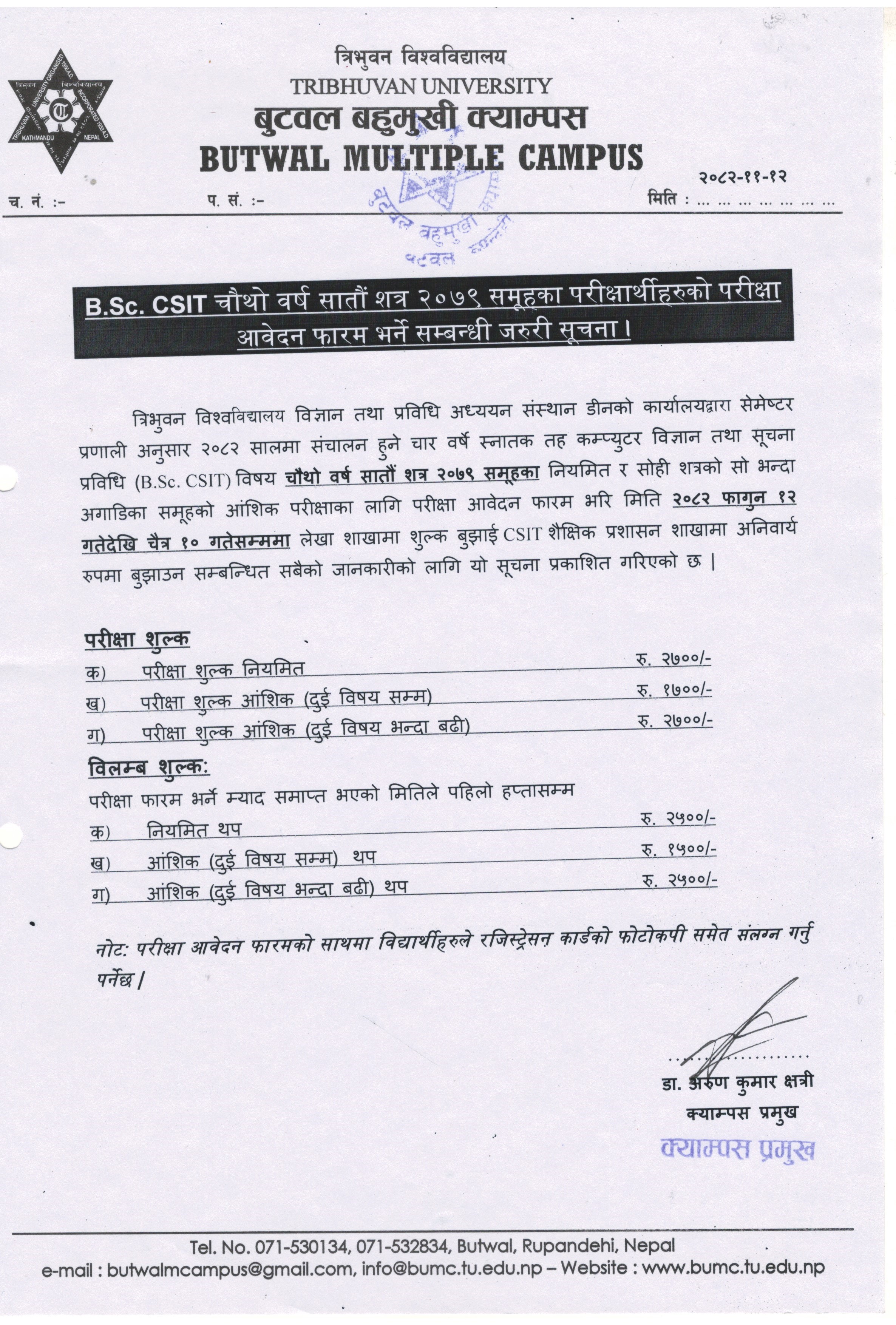 B.Sc. CSIT प्रथम वर्ष प्रथम शत्र २०८२ समूहको परीक्षा फारम भर्ने सम्बन्धी सूचना