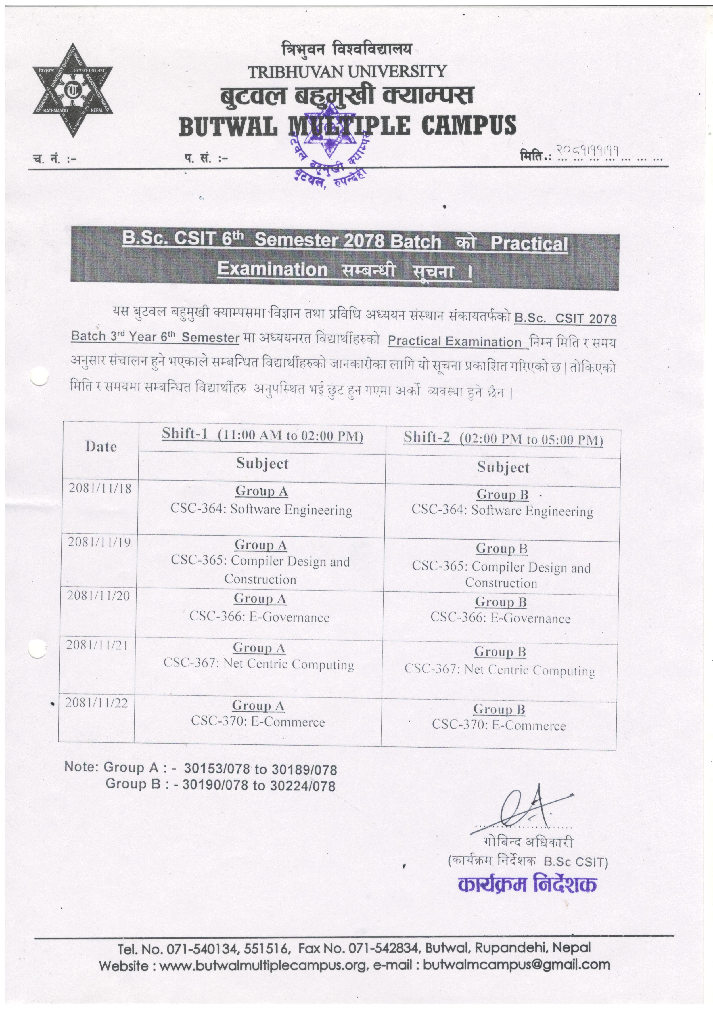 B.Sc. CSIT Sixth Semester 2078 Batch Practical Examination Notice