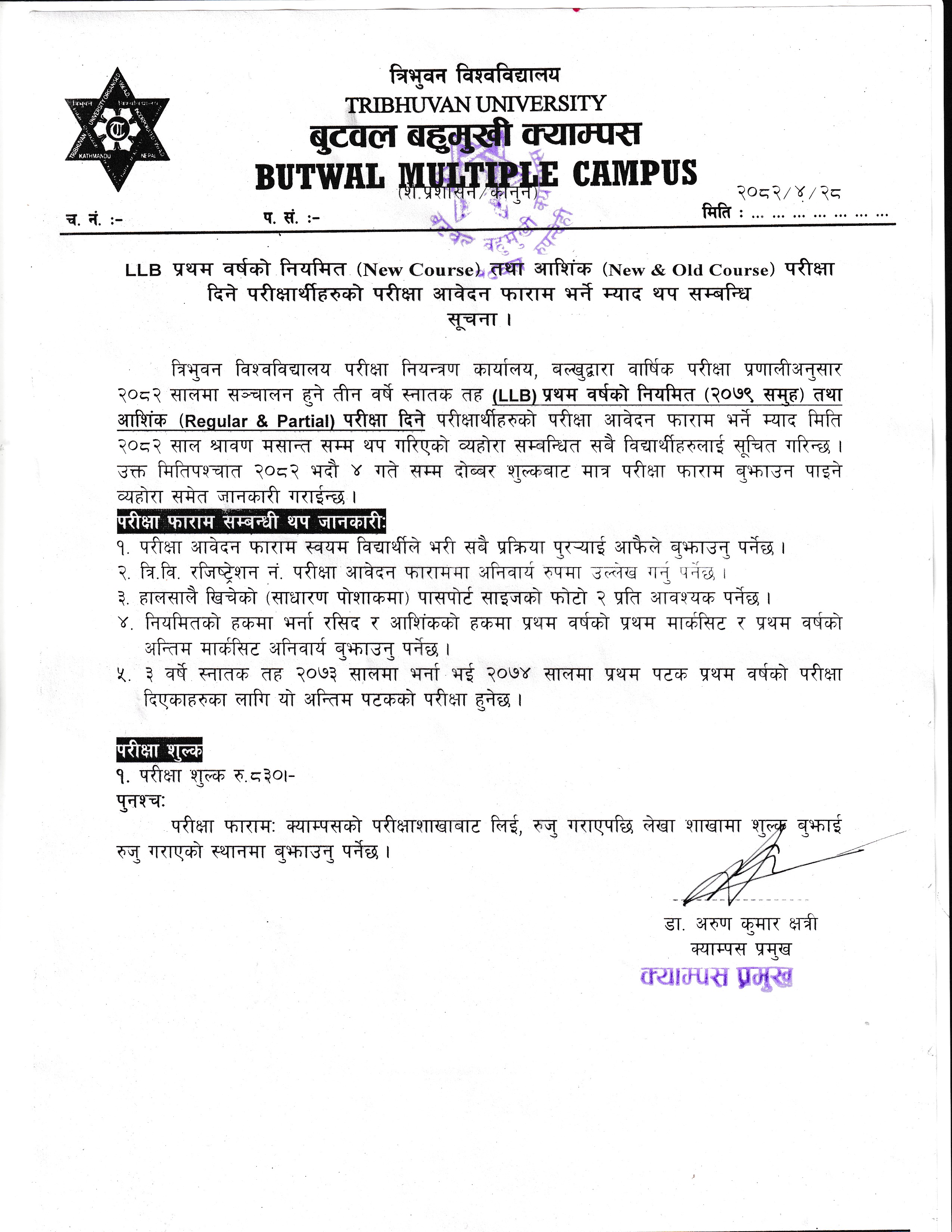 B.Sc. CSIT प्रथम वर्ष प्रथम शत्र २०८२ समूहको परीक्षा फारम भर्ने सम्बन्धी सूचना