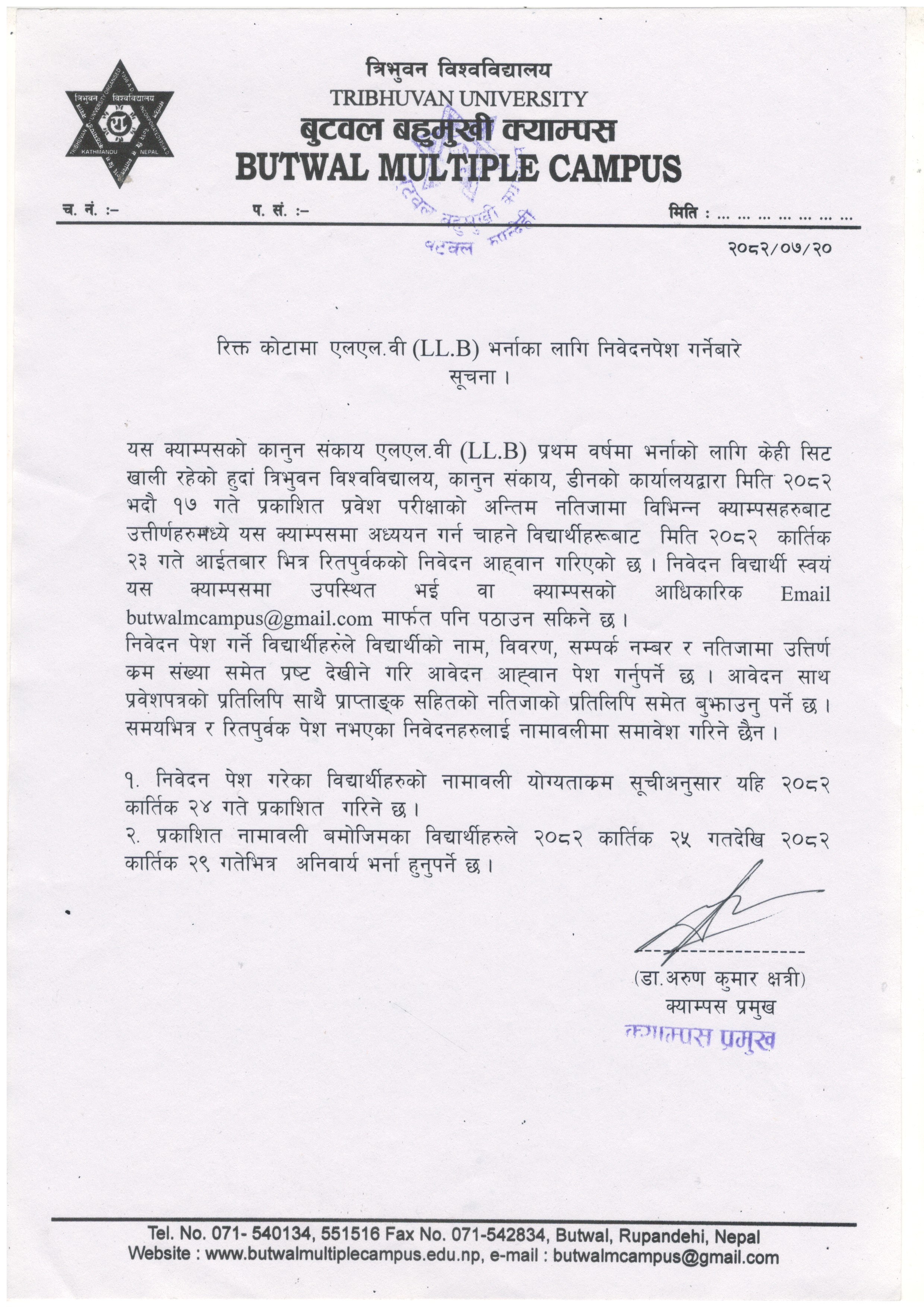 रिक्त कोटामा LL.B भर्नाका लागि निवेदन पेश गर्ने सम्बन्धी सूचना